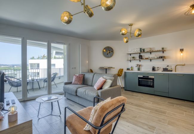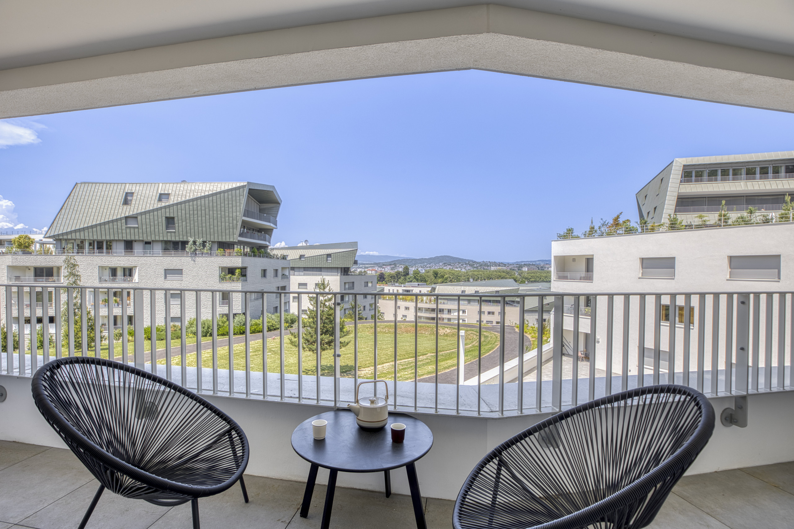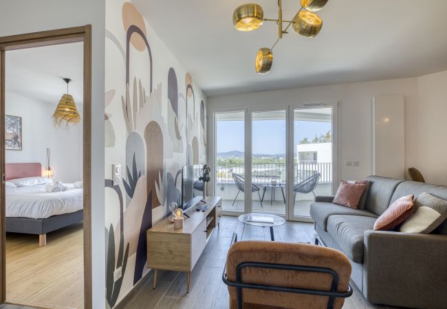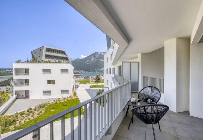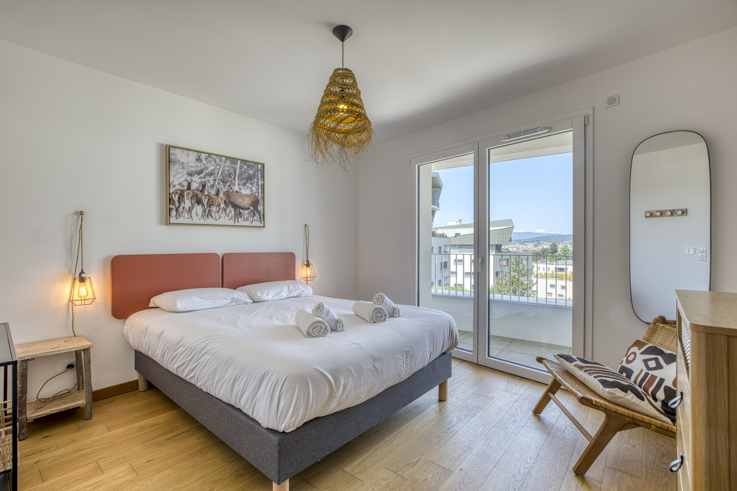 The apartment is tastefully-furnished, is modern, and is 44 m². It has views of waterfront and the mountain.