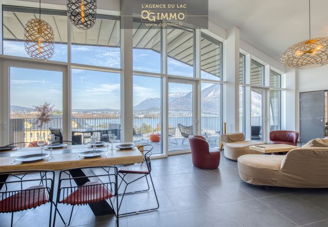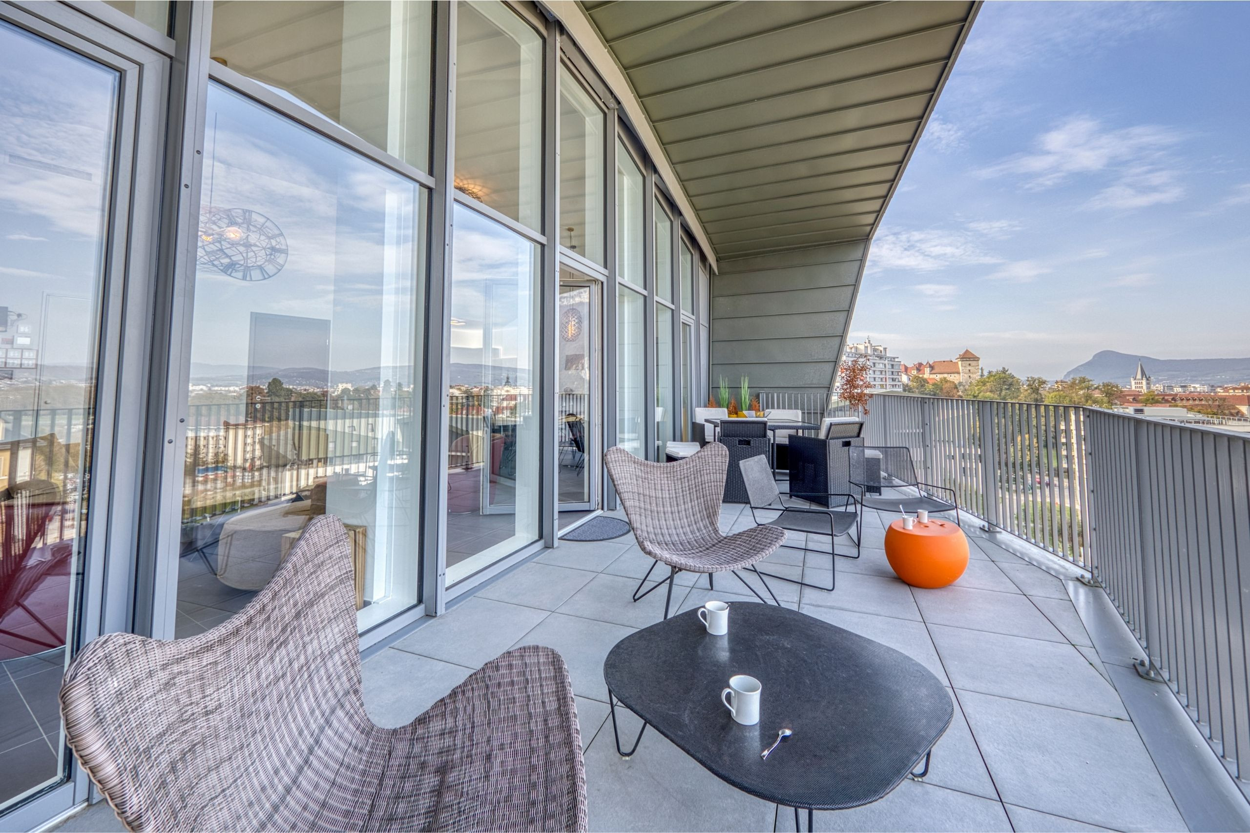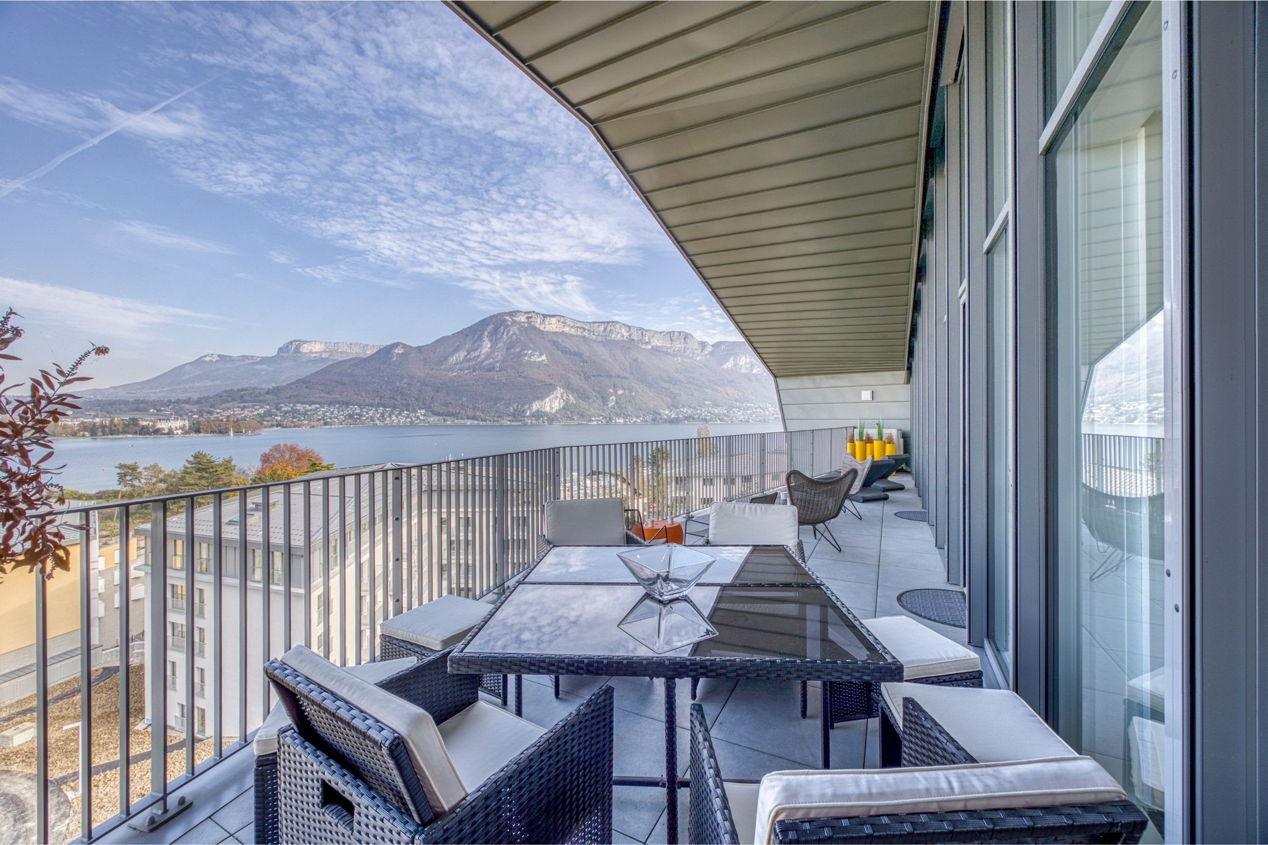 - Terrasse avec vue panoramique dégagée sur les montagnes et le lac d’Annecy.