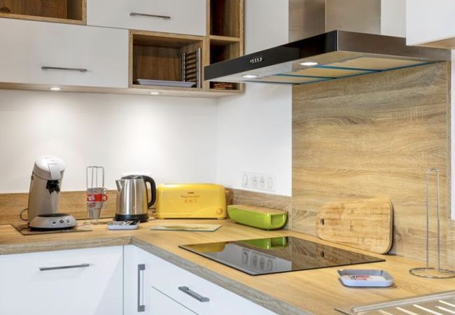 - Cuisine ouverte entièrement équipée : plaques à induction, réfrigérateur, micro‑ondes, four, lave‑vaisselle, cafetière, bouilloire, grille‑pain et ustensiles pour cuisiner facilement.